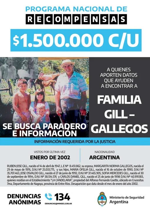 Para quien aporte datos fehacientes de qué pasó con la familia, el Ministerio de Seguridad Nacional otorga una recompensa de $12 millones.
