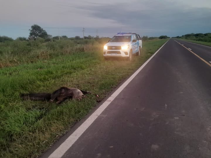 Al llegar constataron un animal de la especie oso hormiguero a la vera del camino, el veterinario policial constató que había fallecido, producto de heridas y contusiones ocasionadas por accidente de tránsito.