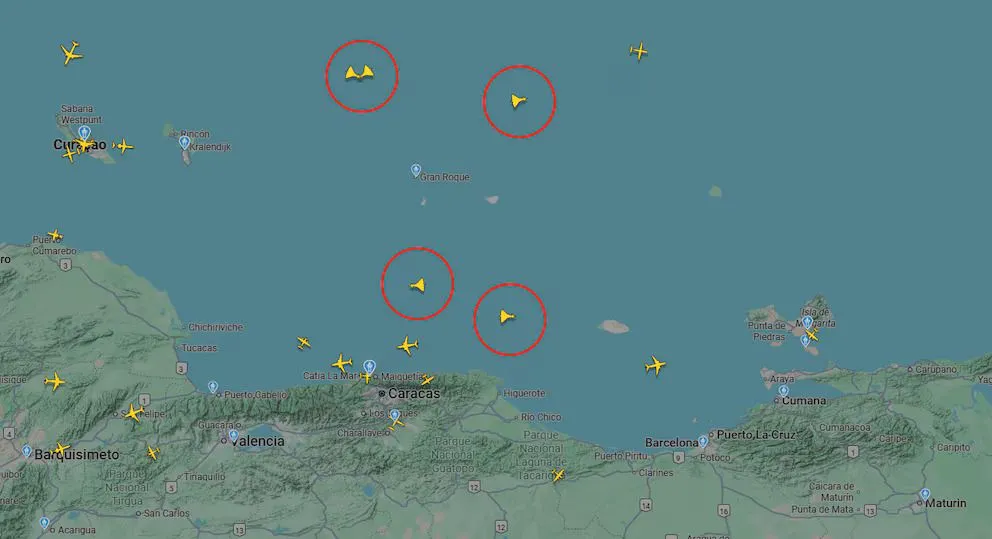 De acuerdo con esos datos, en la zona operan dos Boeing EA-18G Growler y tres Boeing F/A-18E Super Hornet, aeronaves pertenecientes a la Marina estadounidense. La presencia se da a escasa distancia de Caracas y se produce en un escenario de creciente tensión política y militar entre ambos países.