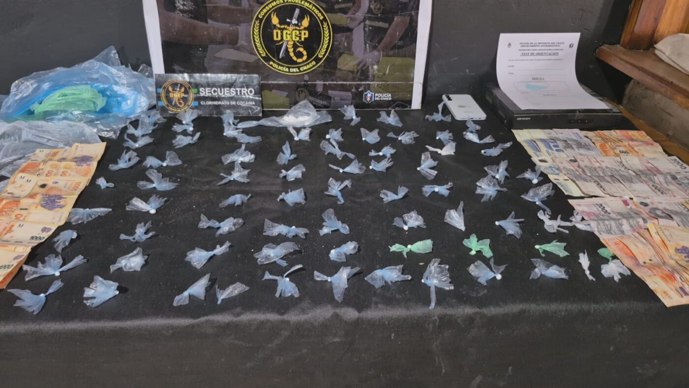 En la vivienda lindante se incautaron: 74 envoltorios con un total de 11,9 gramos de cocaína. $1.005.200 en efectivo. Un teléfono celular marca Samsung modelo A6. Recortes de polietileno y un encendedor.