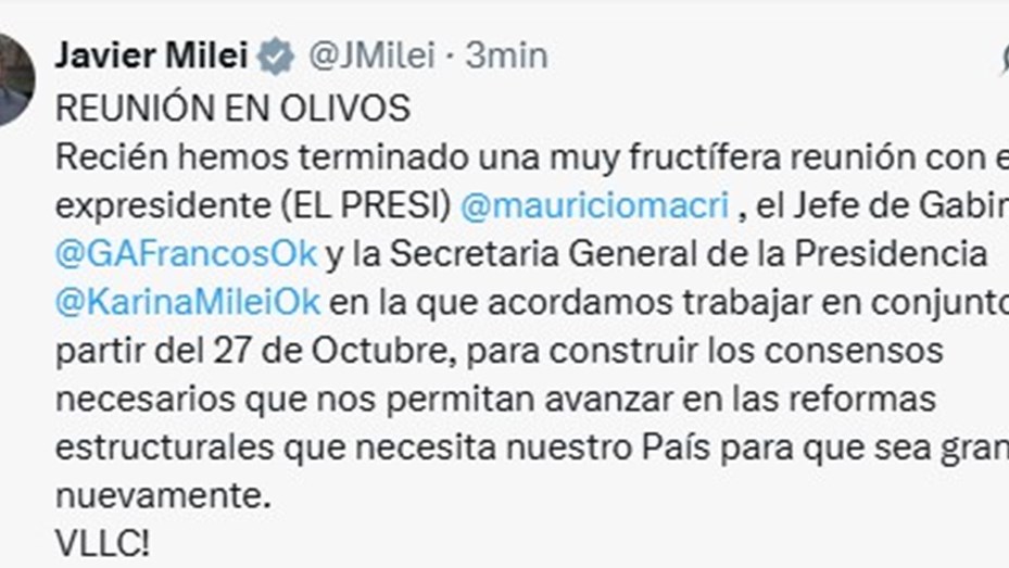 Lee más Milei, tras reunirse con Macri: «Acordamos trabajar en conjunto a partir del 27 de octubre»Estados Unidos hundió otra “narcolancha” frente a Venezuela: cuatro muertos y máxima tensión en el Caribe
