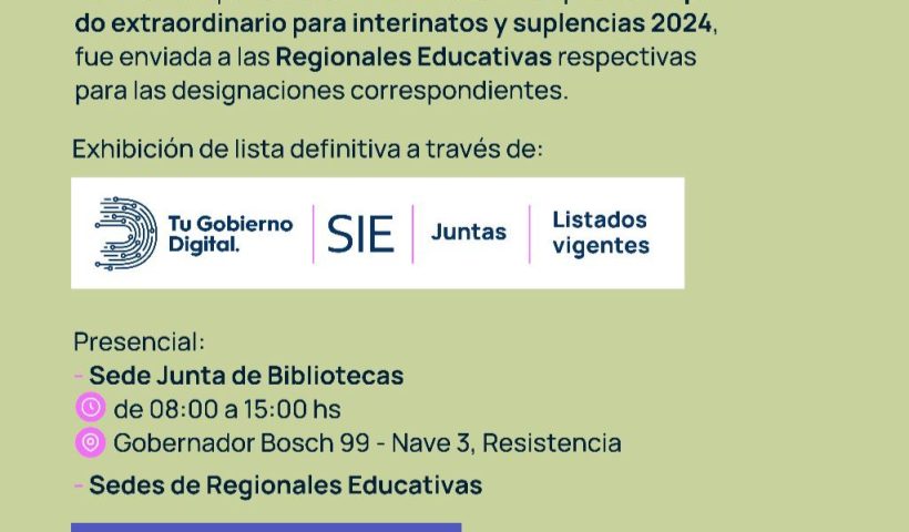 El Ministerio de Educación, Cultura, Ciencia y Tecnología de la Provincia, a través de la Junta de Clasificación de Biblioteca, informa a los docentes bibliotecarios…