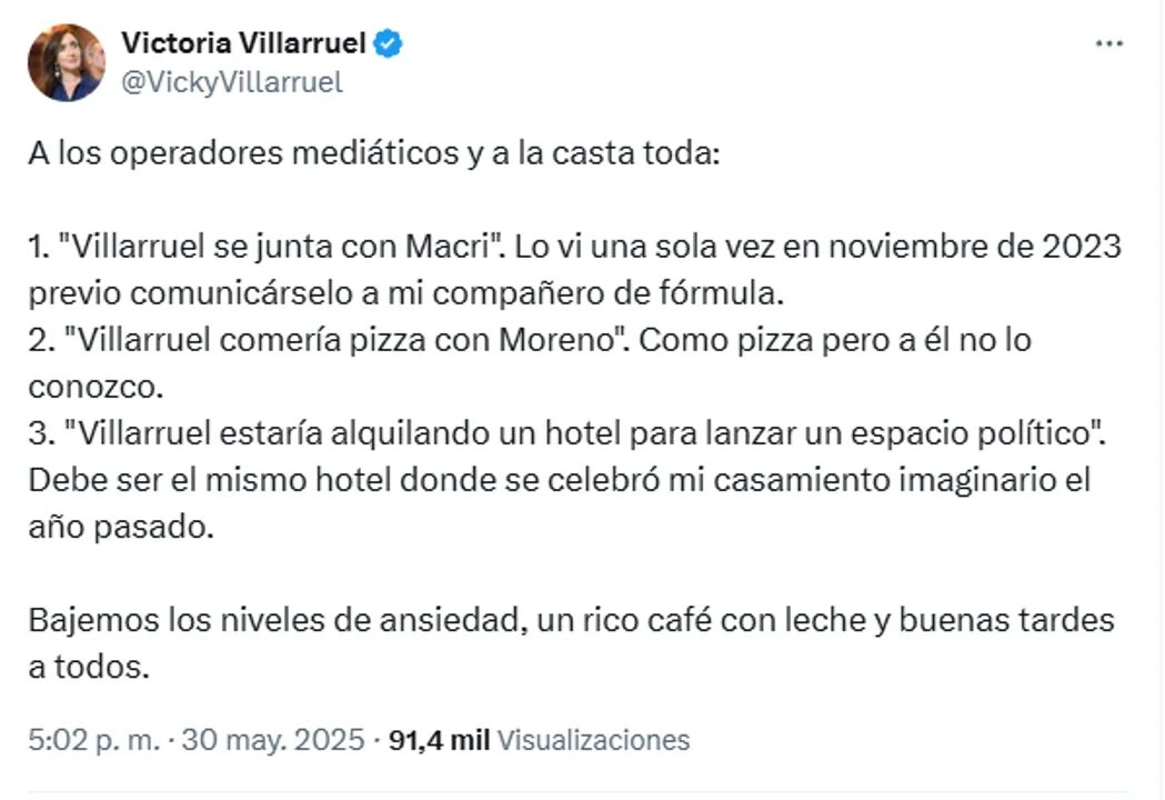 «A los operadores mediáticos y a la casta toda: 1. «Villarruel se junta con Macri». Lo vi una sola vez en noviembre de 2023 previo comunicárselo a mi compañero de fórmula. 2. «Villarruel comería pizza con Moreno». Como pizza pero a él no lo conozco», inició Villarruel en un posteo en X.