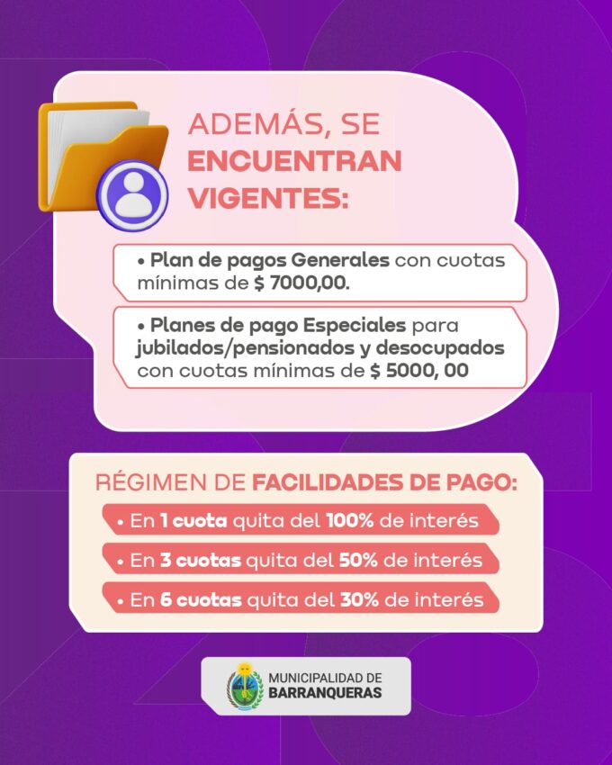 La Municipalidad de Barranqueras mantiene vigentes distintas alternativas de pago con bonificaciones y planes especiales para que los vecinos y vecinas puedan regularizar sus tributos municipales.