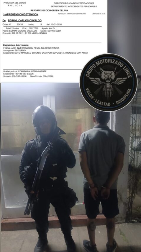 Este lunes a eso de las 4:30, los efectivos del Departamento Operaciones Estratégicas Lince, en calle Ceibo y Fortín Warnes demoraron a un joven de 18 años. Al identificarlo en el Sistema de Gestión Biométrica (Si.Ge.Bi.) detectaron que poseía un pedido de captura en la causa “supuesta desobediencia judicial en contexto de violencia de género”.
