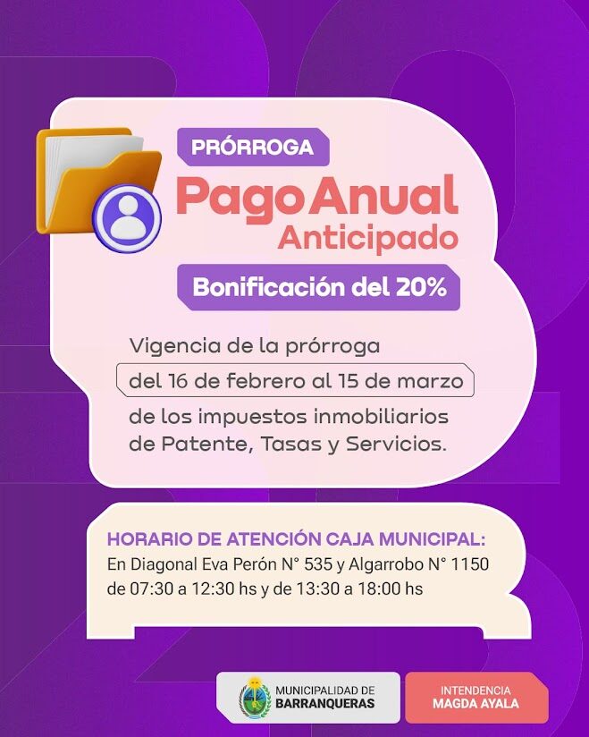 La Municipalidad de Barranqueras informa que se extiende el plazo para acceder al Pago Anual Anticipado de impuestos municipales. Con esta medida, se busca brindar más oportunidades a los vecinos para regularizar sus tributos y acceder a un descuento del 20%