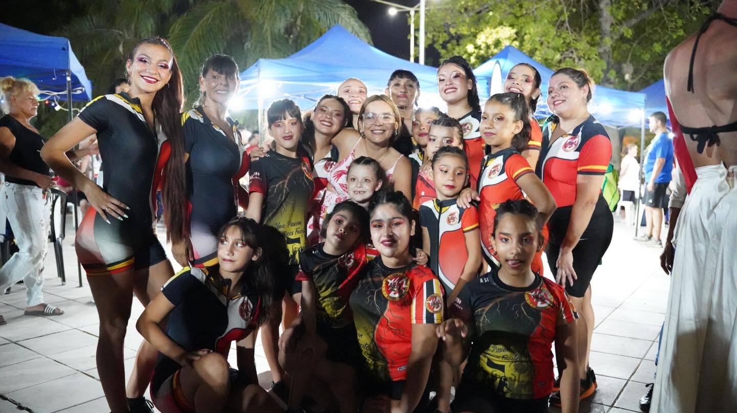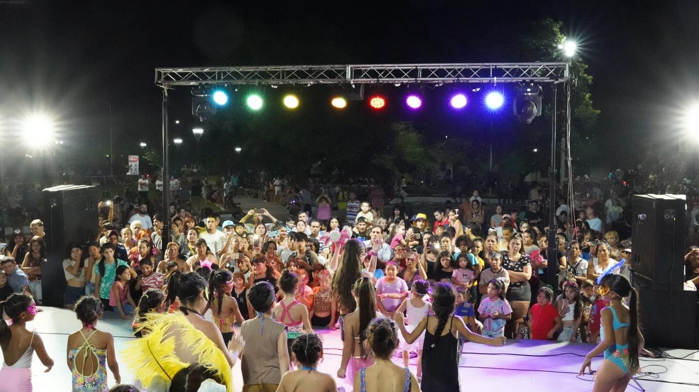 En la Plaza Sarmiento, la intendente Magda Ayala junto a muchos vecinos compartieron una noche llena de ritmo, color y alegría en una muestra de precarnavales de la mano de Disco Samba, Villa Florida y Perla Negra.