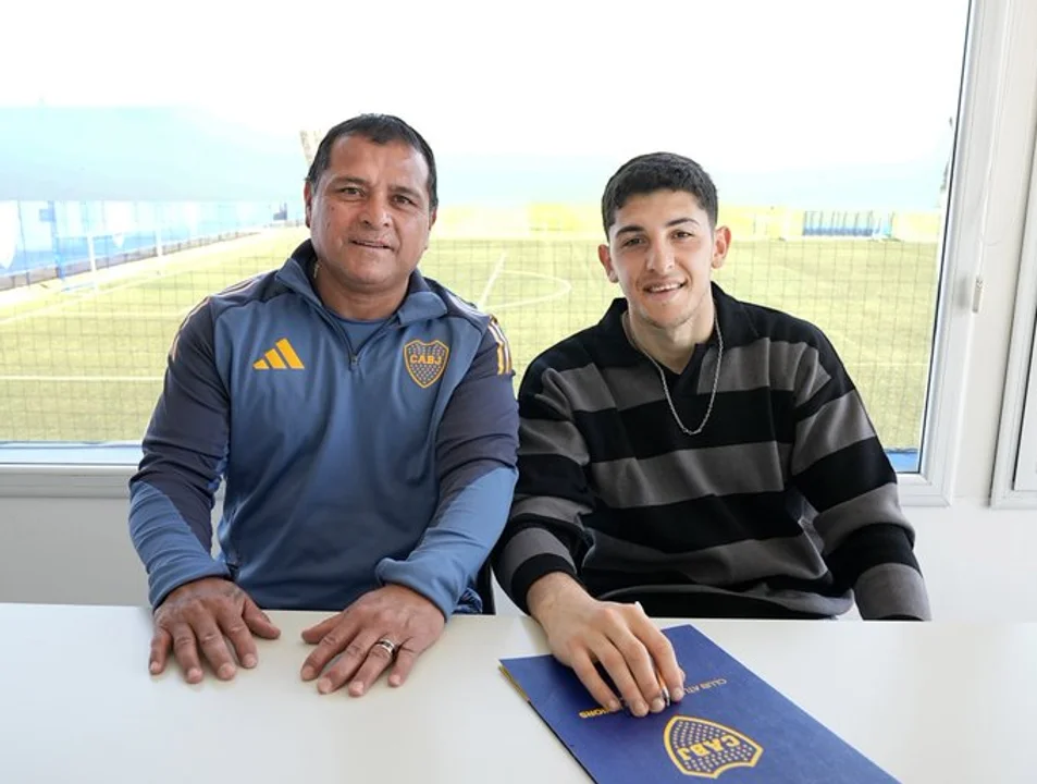El arquero de 22 años posó junto a Marcelo Delgado en la Bombonera en la foto oficial de la firma, gesto que refleja la confianza que el club deposita en él como pieza de futuro.