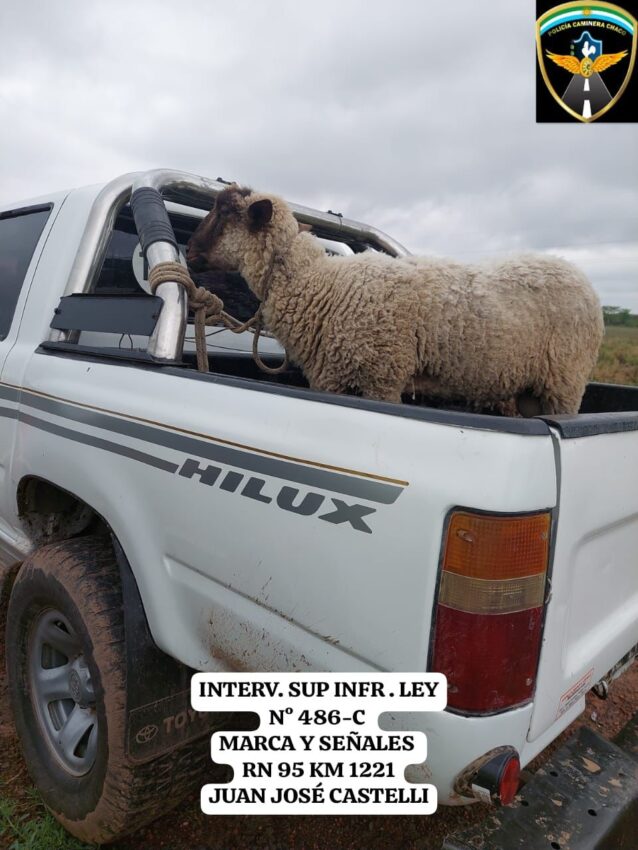 Hoy, agentes viales de la Castelli cuando realizaban un control en ruta nacional N° 95 km 1221, demoraron el paso de una camioneta marca Toyota Hilux, color blanca cuyo conductor, de 39 años, transportaba 2 animales ovinos en la caja del rodado.