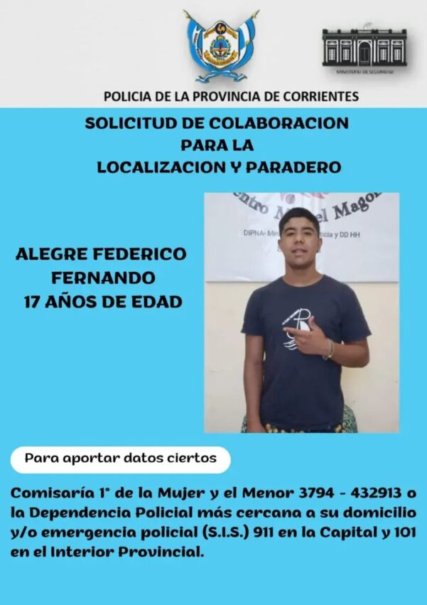La Policía solicita colaboración para dar con el paradero de Federico Fernando Alegre, un adolescente de 17 años que se encuentra ausente del hogar desde…