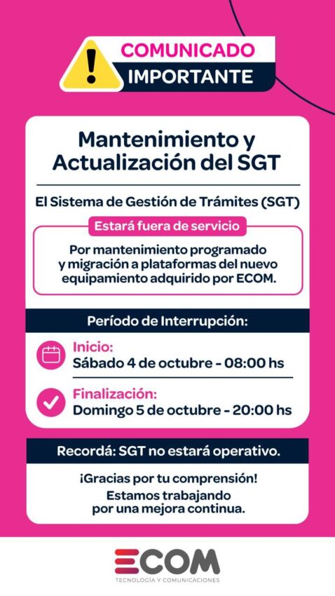 Ecom Chaco informa que el Sistema de Gestión de Trámites (SGT) estará fuera de servicio debido a un mantenimiento programado y migración a nuevas plataformas.…