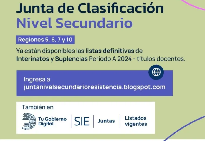 El Ministerio de Educación de la Provincia, a través de la Junta de Clasificación de Nivel Secundario- Sede Resistencia- Regiones 5, 6, 7 y 10-…