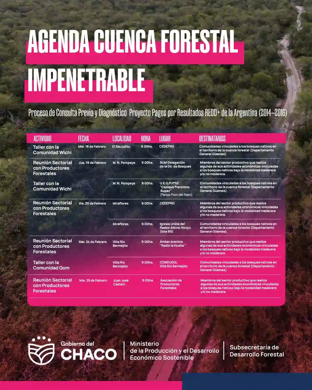 Las actividades se desarrollan a través de la Subsecretaría de Desarrollo Forestal y forman parte del Proceso de Consulta Previa y Diagnóstico para el Plan de Gestión de la Cuenca Forestal Impenetrable, en el marco del Proyecto Pagos por Resultados REDD+ de la Argentina (2014–2016).