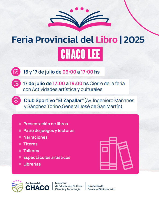 Desde el miércoles 16 y hasta el domingo 20 de julio se llevará a cabo, en simultáneo en tres sedes, la Feria Provincial del Libro 2025, Chaco lee, organizada por el Gobierno del Chaco, a través del Ministerio de Educación. Se realizarán presentaciones de libros, narraciones, talleres, patio de juegos, lecturas, espectáculos artísticos, librerías, títeres, entre otras actividades para estudiantes de todos los niveles, docentes y familias.