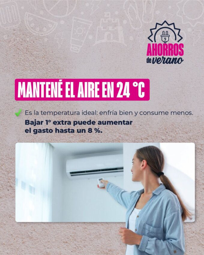-Temperatura ideal del aire acondicionado: mantener los equipos entre 24°C y 26°C. Cada grado menos incrementa el consumo en alrededor del 8%. Se recomienda apagarlos en ambientes sin uso y complementarlos con ventiladores para mejorar la circulación del aire.
