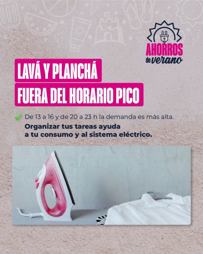 -Planchar y lavar en horarios de menor demanda: realizar estas tareas fuera de los picos (13 a 16 y de 20 a 23) contribuye a aliviar la red eléctrica. SECHEEP recomienda hacerlo temprano por la mañana o después del atardecer. Si bien no reduce el consumo total, sí ayuda a evitar saturaciones en los horarios críticos.