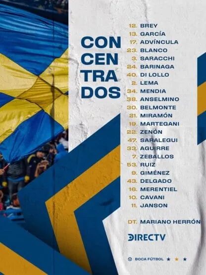 Otros nombres que tampoco aparecen son los de Nicolás Figal (suspendido por llega a la quinta amonestación), Juan Ramírez y Frank Fabra. Estos últimos dos no venían siendo parte de la cosndeiración del anterior DT, Diego Martínez, y todo indicaría que no volverían a vestir la camiseta azul y oro.