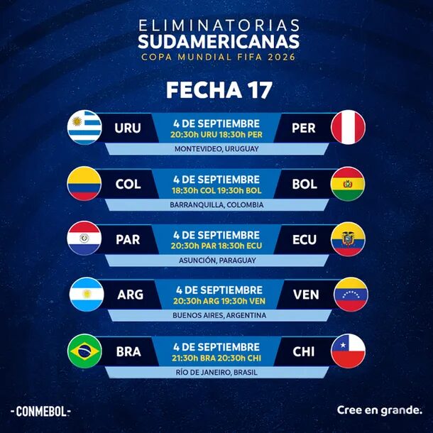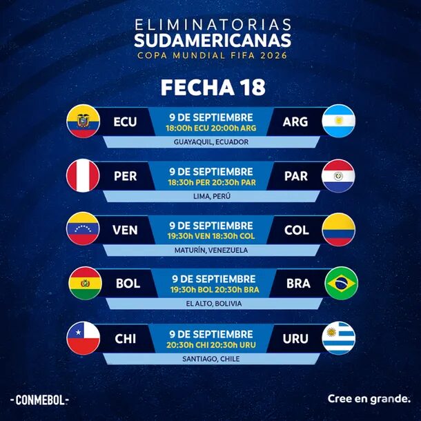 En cuanto a la fecha 18, también está prevista con horario unificado: los duelos definitorios serán: Perú vs. Paraguay, Venezuela vs. Colombia, Bolivia vs. Brasil y Chile vs. Uruguay, todos desde las 20:30. Argentina y Ecuador, por su parte, jugarán a la misma hora en tierras ecuatorianas.