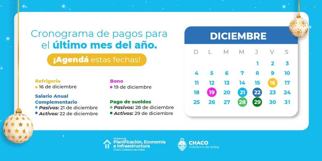 El Ministerio de Planificación, Economía e Infraestructura informa que este viernes, con la acreditación del Refrigerio, iniciará el cronograma de pagos de diciembre. Este mes incluye un bono por única vez, el pago de Sueldo Anual Complementario y los salarios, más la implementación de descuentos a través de Superdías.