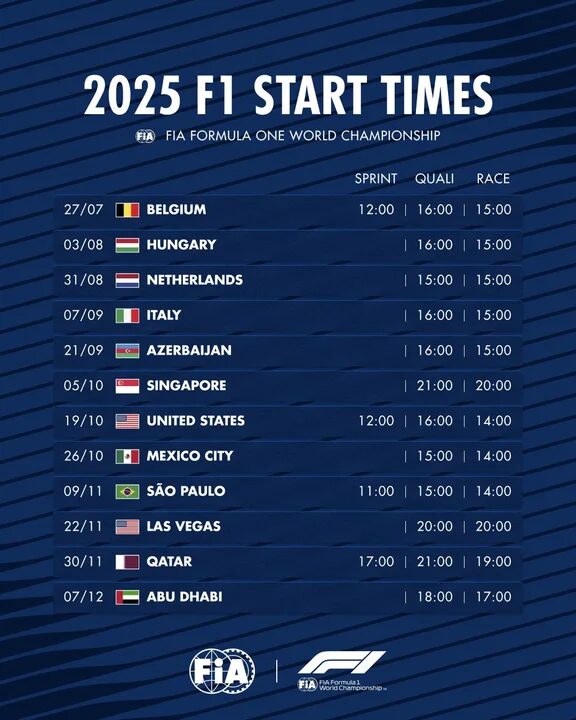 Las carreras nocturnas de Arabia Saudita y Singapur se mantendrán en su tradicional horario de las 20:00 horas, mientras que el Gran Premio de Qatar se adelantará a las 19:00 horas. Bahréin, por su parte, comenzará a las 18:00 horas, y el Gran Premio de Abu Dhabi, que cerrará la temporada, dará inicio a las 15:00 horas.