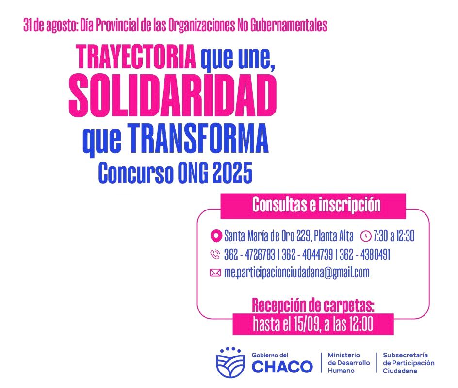 El Ministerio de Desarrollo Humano, en el marco del Día Provincial de las ONG, establecido por Ley 1257-E, cada año lleva adelante un concurso para elegir a la Organización No Gubernamental, con el lema 2025: “Trayectoria que Une, Solidaridad que Transforma”.