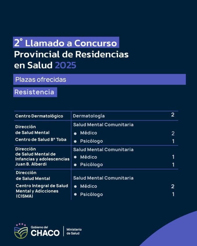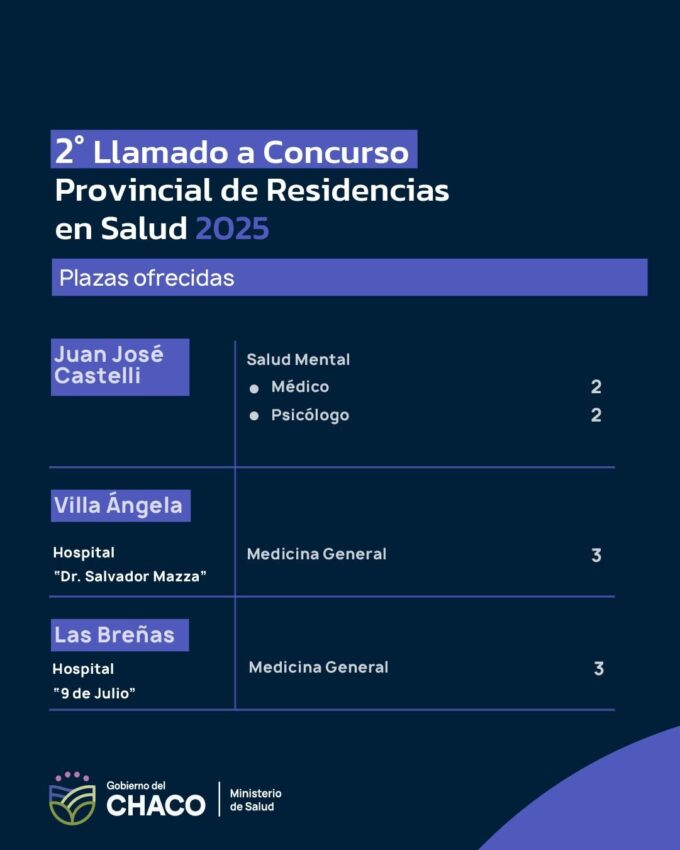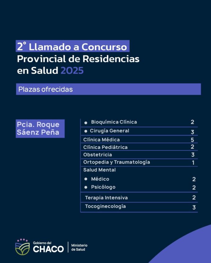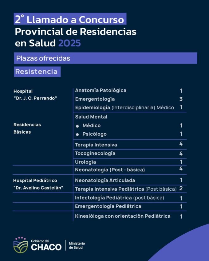 El Ministerio de Salud Pública del Chaco informa que se encuentran disponibles plazas para la realización de residencias en las siguientes especialidades: