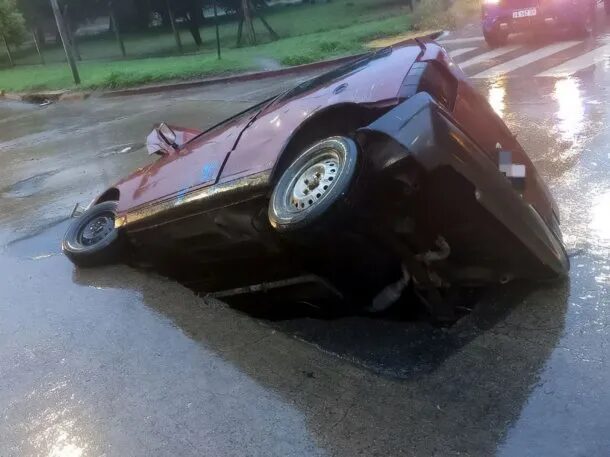 El conductor de 47 años identificado como P.C.S., circulaba en un Fiat Uno de color bordó. Mientras transitaba bajo la lluvia, su automóvil cayó lateralmente en el socavón, del que hasta ahora se desconoce cómo se generó.