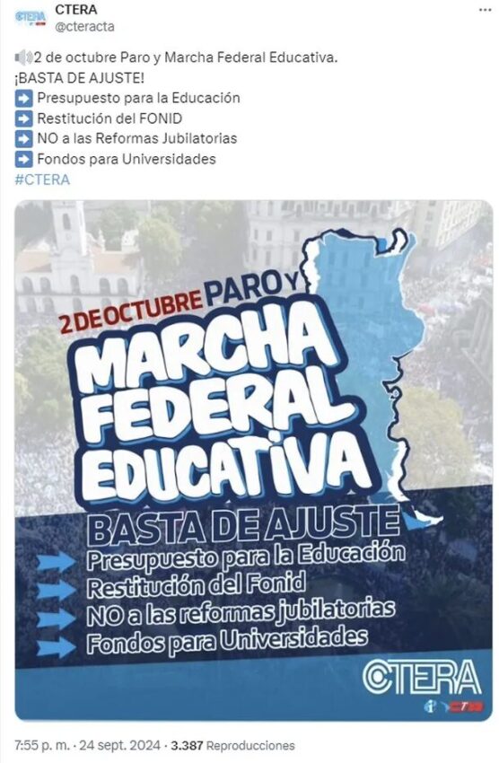 En un flyer publicado el martes por la noche en la cuenta oficial de CTERA en X (ex Twitter), afirmaron: «2 de octubre Paro y Marcha Federal Educativa. ¡BASTA DE AJUSTE».