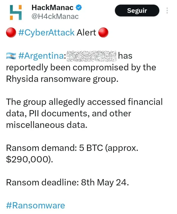 Como es habitual en este tipo de incidentes, la propia organización cibercriminal se encargó de anunciar el «golpe» y hacer públicas sus demandas en foros de la Deep Web (internet profunda), metodología habitual. El anuncio brinda una breve descripción de las actividades de la empresa, incluyendo su logo, e incluye imágenes a modo «preview» desenfocadas como supuesta prueba de la documentación comprometida que, en ese caso, constaría de archivos financieros, datos personales (DNI) y tarjetas de crédito. Para «devolver» a la empresa el control de la documentación, Rhysida pide nada menos que 5