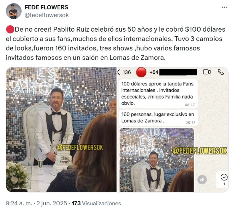 El periodista de espectáculos, Fede Flowers, relató la información y mostró fotos exclusivas de lo que fue el evento puertas adentro: “De no creer! Pablito Ruiz celebró sus 50 años y le cobró $100 dólares el cubierto a sus fans, muchos de ellos internacionales».