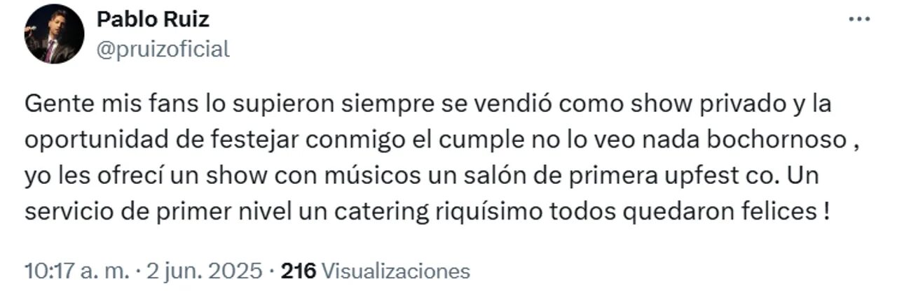 Al enfrentarse con numerosas críticas, el cantante utilizó sus redes sociales para esclarecer lo sucedido, sosteniendo que sus fanáticos eran conscientes de lo que estaban pagando: “Mis fans lo supieron siempre, se vendió como show privado y la oportunidad de festejar conmigo el cumple, no lo veo nada bochornoso. Yo les ofrecí un show con músicos, un salón de primera Upfest co. Un servicio de primer nivel, un catering riquísimo, todos quedaron felices”.