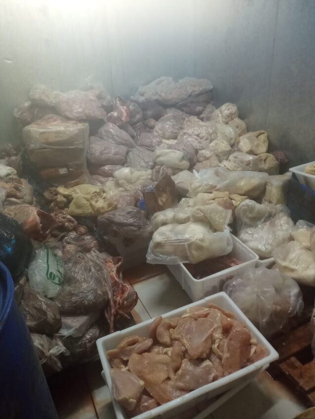 Posteriormente, al ingresar al sector de cámara de frío de 5×3 metros, se constató la existencia de gran cantidad de productos cárnicos en condiciones no aptas para consumo. Entre lo secuestrado se contabilizó: