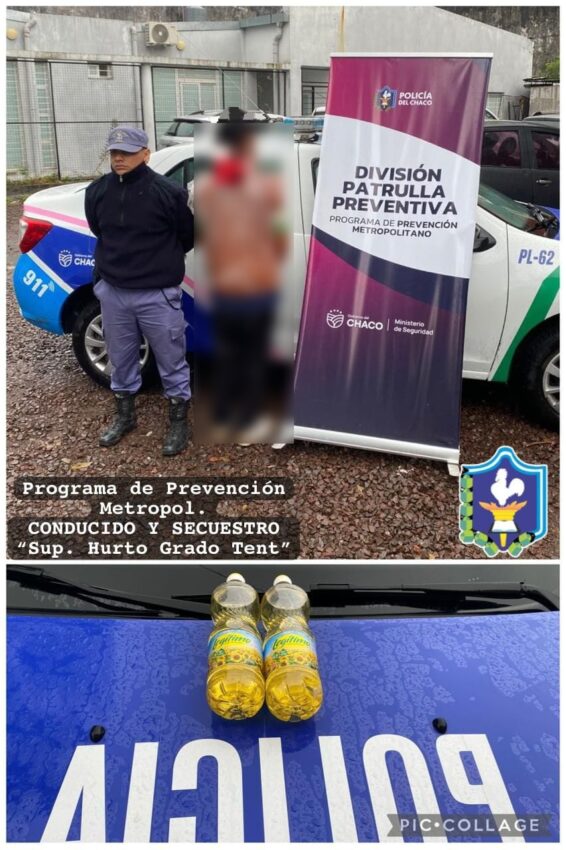 Este lunes a eso de las 11:30, agentes de la División Patrulla Preventiva demoraron a un hombre de 40 años que se llevó dos botellas de aceite sin abonar, de un local ubicado por la avenida Vélez Sarsfield al 830, de Resistencia.