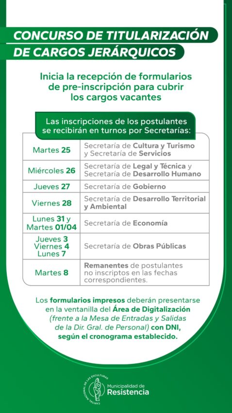 La Municipalidad de Resistencia informa que se encuentra publicado en la página web oficial del municipio www.resistencia.gob.ar el primer llamado a concurso para cubrir vacantes jerárquicos.. En la sección Soy Agente Municipal – Concurso Interno se encuentra toda la información correspondiente y el formulario para pre-inscribirse.
