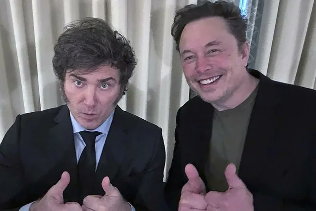 una imagen donde se ve a Milei y a Messi, ambos con trajes oscuros y los pulgares arriba.