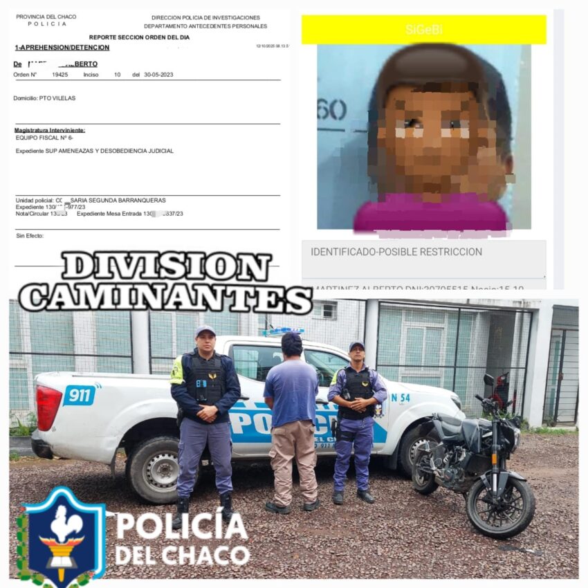 El sujeto manifestó llamarse Alberto Martínez, de 41 años, domiciliado en manzana 47, parcela 6 del barrio 2 de Abril. Tras verificar sus datos en el sistema SiGeBi, los agentes constataron que el hombre registraba un impedimento legal vigente por las causas “Supuestas Amenazas y Desobediencia Judicial”, solicitado por la Comisaría Segunda de Barranqueras.