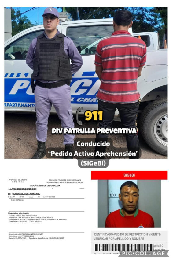 El procedimiento ocurrió en la fecha y hora señaladas, cuando los efectivos policiales detuvieron para identificación a Gustavo Ariel González, de 39 años. Al ser verificado a través de la plataforma SIGEBI, se constató que el hombre tenía un pedido de detención vigente conforme a la Orden 20189, Inciso 18, con fecha 08/05/2025, emitida por el Equipo Fiscal N.º 2 de Resistencia, a cargo de la Dra. Ana Graciela González de Pacce.