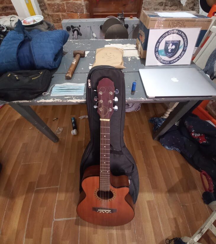 - En otro allanamiento realizado en calle Brown al 2500, se incautaron una MacBook, una guitarra electroacústica, una campera azul, un cartucho calibre 16 y 462 gramos de marihuana, además de una balanza digital. En este lugar fueron detenidos C. N. C. (33) y E. G. A. R. (38), quienes también quedaron implicados en una causa por infracción a la Ley 23.737 de Estupefacientes, con intervención de la Fiscalía Antidrogas N° 1.