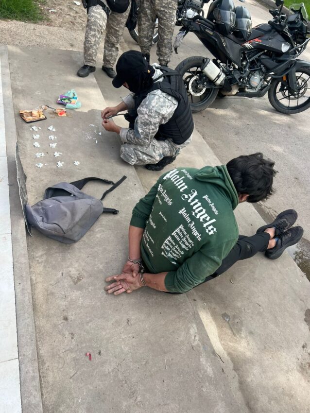 Al llegar al lugar, los agentes observaron a un hombre con las características aportadas –buzo verde, pantalón jogger negro y mochila gris– que, al ser identificado, mostró nerviosismo y una actitud hostil, por lo que fue reducido y esposado preventivamente.