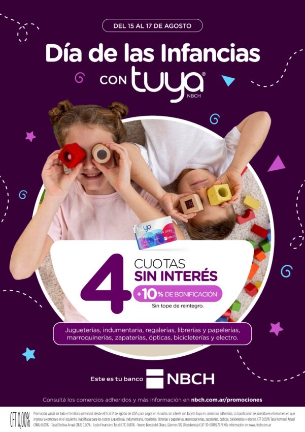 Nuevo Banco del Chaco tendrá una promoción especial con Tarjeta Tuya para acompañar la celebración del Día de las Infancias con 4 cuotas sin interés más 10% de bonificación sin tope de reintegro, en comercios adheridos de toda la provincia.