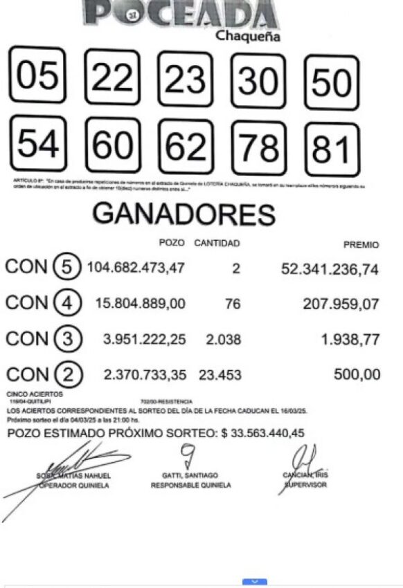Uno de los ganadores es oriundo de la capital chaqueña y realizó su apuesta en la agencia 702 – 00, seleccionando los números 30, 60, 62, 78 y 81. En tanto, otro afortunado de Quitilipi eligió la combinación 05, 22, 23, 60 y 78 en la agencia 119 – 04.