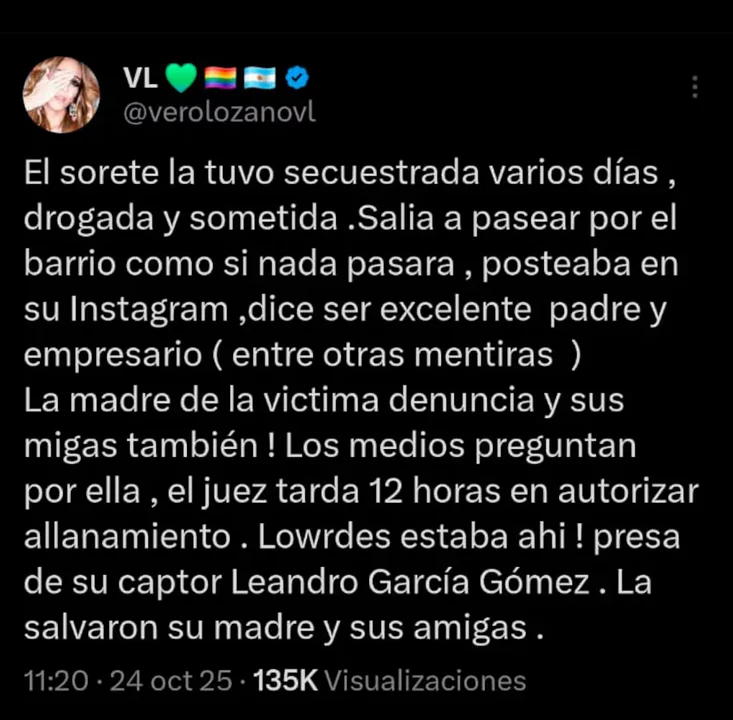 “La madre de la víctima denuncia y sus amigas también. Los medios preguntan por ella, el juez tarda 12 horas en autorizar el allanamiento. Lowrdez estaba ahí, presa de su captor Leandro García Gómez. La salvaron su madre y sus amigas”, concluyó en el posteo.