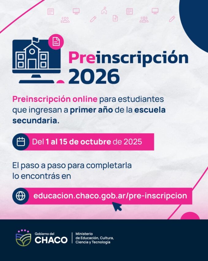 El Ministerio de Educación del Chaco informa que el período de preinscripción para el ingreso a primer año del nivel Secundario 2026, de todas las unidades educativas públicas de gestión estatal, social y comunitaria se realizará del 1 al 15 de octubre de este año. Tal como viene realizándose en los últimos años, será de manera virtual a través del Sistema Integral de Educación (SIE) de la provincia, en la plataforma Tu Gobierno Digital. Quienes no cuenten con conectividad, podrán hacerla de manera presencial, en formato papel, ante la unidad educativa seleccionada y dentro del plazo mencionado.