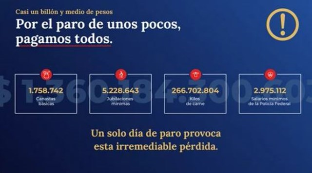«Por el paro de unos pocos, pagamos todos”, sostuvo y dijo que “un solo día de paro provoca esta irremediable pérdida”.