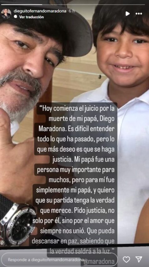 Este miércoles se llevó a cabo la primera audiencia del juicio contra la enfermera Gisella Madrid, acusada por el “homicidio con dolo eventual” de Diego Armando Maradona, quien murió en noviembre de 2020. En ese contexto, Dieguito Fernando, hijo del astro futbolístico y Verónica Ojeda, publicó un sentido posteo en sus historias de Instagram con emotivas palabras dedicadas a su papá.