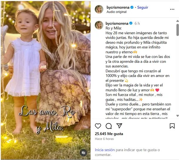 En su publicación, Cris Morena recordó a ambas con profundo amor. “Hoy 28 se me vienen imágenes de tanto vivido juntas. Ro, hija querida, desde mi deseo más profundo. Y Mila chiquitita mágica, hoy juntas en ese infinito nuestro y eterno”, escribió.