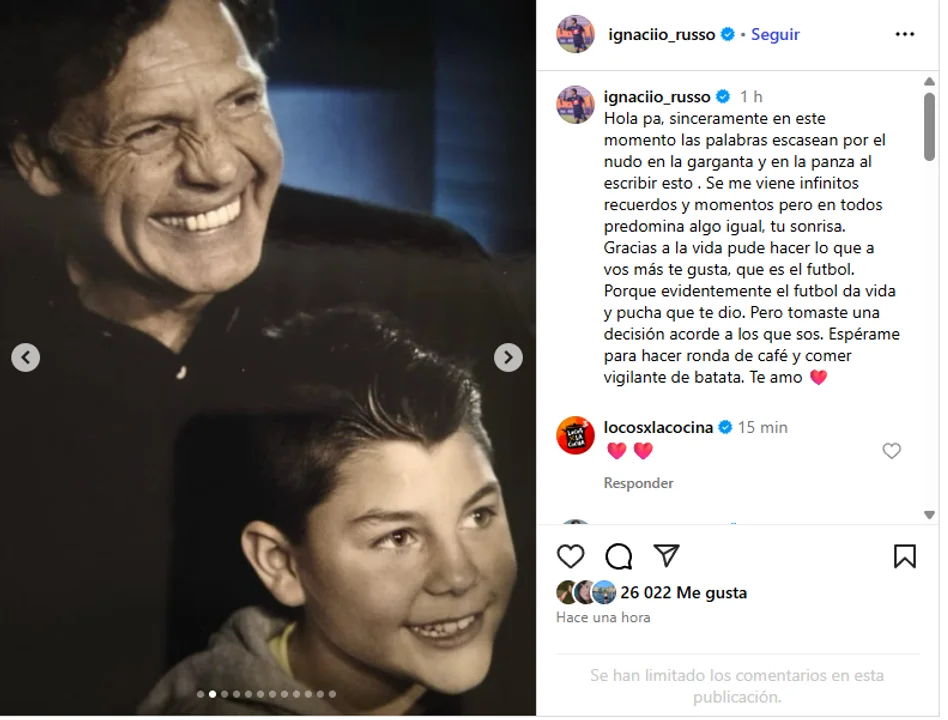 Ignacio Russo, hijo de Miguel Ángel Russo, realizó un emotivo posteo en redes sociales en el que le dedicó unas sentidas palabras a su padre luego de su fallecimiento, el pasado miércoles mientras se encontraba internado en su domicilio.