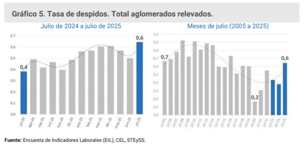 En términos interanuales, los despidos aumentaron levemente en relación con julio de 2024; y en comparación con los meses de julio de los años anteriores, se observa el valor más alto desde julio de 2016.