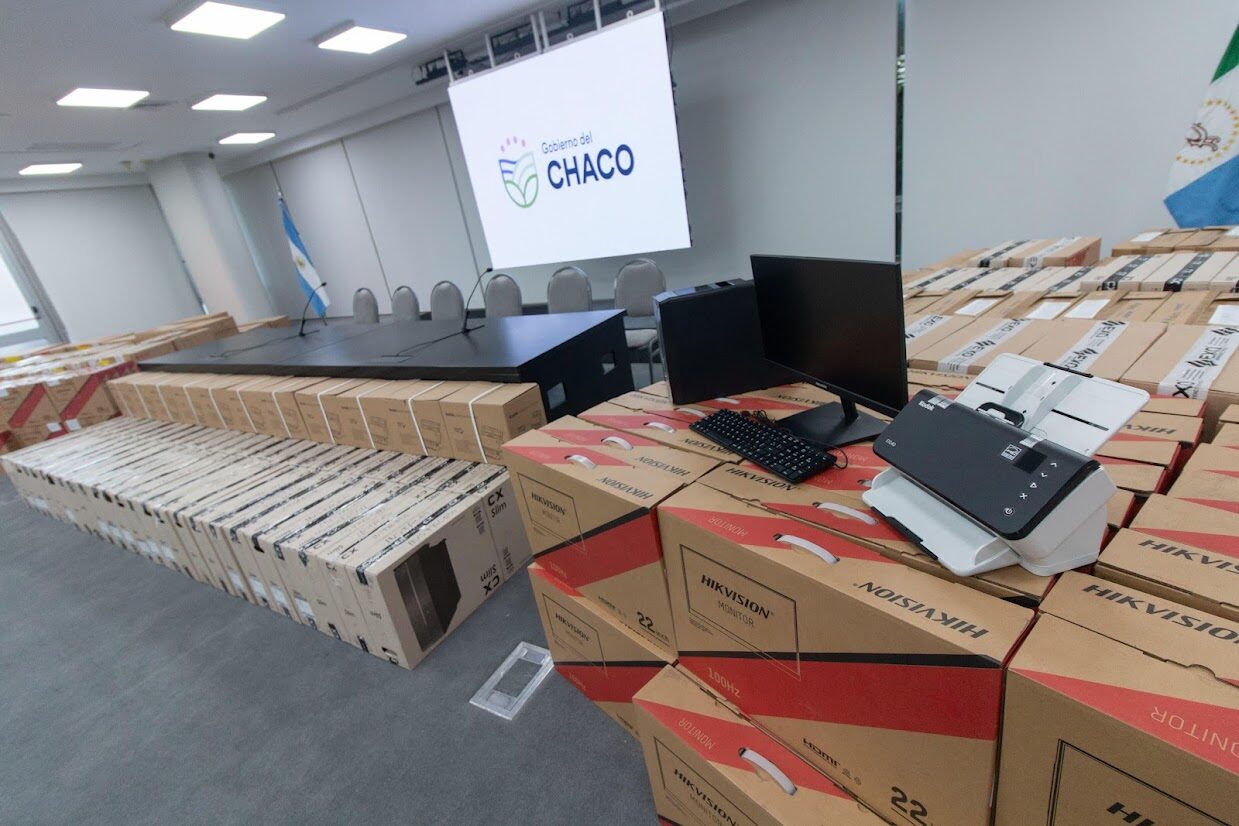 Esta tarde, el gobernador Leandro Zdero, acompañado por el ministro de Gobierno, Jorge Gómez, entregó 250 equipos informáticos que serán destinados a los 99 Registros Civiles de toda la provincia. “La misión es poder acompañarlos, sabemos que falta muchísimo, pero dar este servicio a la gente requería también poder genera una compra de insumos para algo tan esencial como es la tecnología en estos tiempos”, expresó el primer mandatario provincial, destacando en ese sentido la presencia en territorio del Ministerio de Gobierno y la gestión del Ministerio de Hacienda.