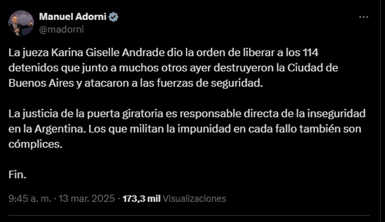 “La jueza Karina Giselle Andrade dio la orden de liberar a los 114 detenidos que junto a muchos otros ayer destruyeron la Ciudad de Buenos Aires y atacaron a las fuerzas de seguridad”, sostuvo el funcionario desde su cuenta de X.